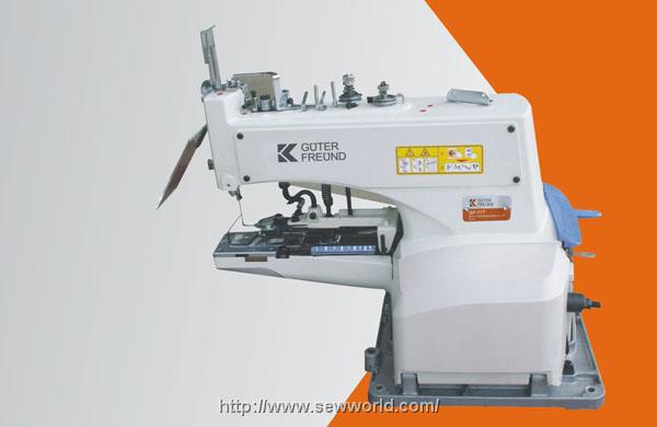 可简单的进行从4孔到2孔,钮扣孔之间的间隔以及针数8-16针等缝制规格的变更。而且,即使是钮扣孔之间变更,也可通过扳手操作简单地进行变更。 通过采用抬压脚以及连动的简洁的切线机构,可使线残量减少,能得到优美的缝制。 即使是每分钟1500针的高速运转,也能进行稳定的缝制,单独地预备停止装置,减缓了停止时的冲击力,能施行优美且正确的包扣缝制。