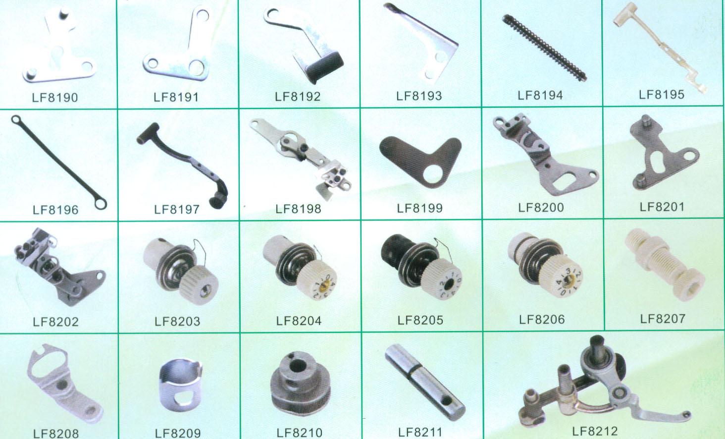 LF8190--LF8212本公司主要生产: 中高档原子喉 铁氟龙高压管 硅胶管 中压管 经销进口纱带 锁眼机刀片类 张小泉、驼鲁牌蜻蜓剪刀 MGS、富凌牌、快可利各类中、高档纱剪 扬州上工 铁岭旋梭 各种DY压脚 XDD分线机 拉筒 卷尺 钢带 放码尺 喷枪吊瓶斗 全蒸汽漏斗靴底配件及附件齐全 15-1、6-1、28-1 5550零配件