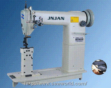 技术特色:FA-810/820型高头厚料机采用单直机针,滑杆挑线,立式旋梭勾线,形成单、双线锁式线迹,上下轴采用螺旋伞齿轮转动。采用立柱式缝台滚轮压脚(或一般压脚),低噪音、低振动。适用于皮鞋、运动鞋、皮包等类似物品的曲线缝制。