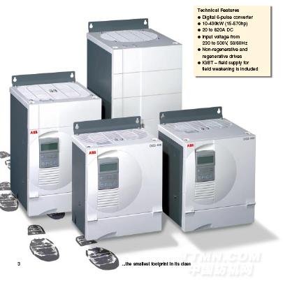 DCS 400直流传动,两象限或四象限运行,直流输出20 - 1000 A,3相交流输入230 - 500 V。 DCS400采用全新的设计,应用最新的半导体技术,增加了产品的可靠性。新颖的软件结构使调试过程变得非常简单。小巧的设计为用户节省了大量的空间。紧凑的设计还体现在其完全内置的磁场单元:内部包含磁场电抗器和熔断器。由于磁场单元使用了IGBT技术,所以没有必要再根据不同的供电电压选用磁场变压器。