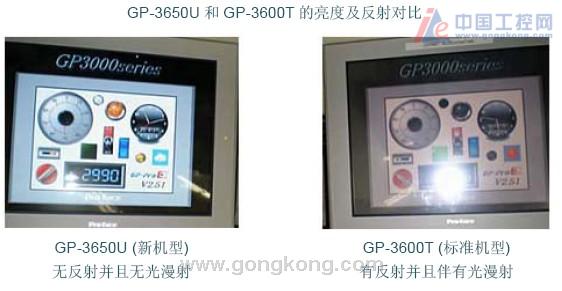 可编程人机界面GP-3650U 配置了高亮度TFT 真彩LCD 显示屏和LED 背光灯,并采用抗反射结构设计。尽管此机型的亮度提高了一倍,但其功耗却与标准机型相同,因此其节能效果较好。GP-3650U 支持多媒体功能,可满足客户对于较大显示屏幕以及视频显示的功能要求,比如商业资讯、录制以及播放安防摄像头所传递的信息。