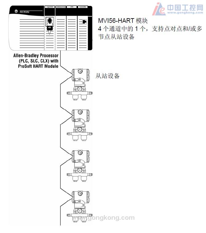 在一个Allen-Bradley ControlLogix processor 处理器的配合下,MVI56-HART模块能够在每个HART通道上连接15台设备。在模块上的4个端口在各自的网络里支持主站协议命令发送到从站设备。每个端口都可以独立设置。HART网络和Allen-Bradley ControlLogix处理器之间的数据交换利用的是模快包含的内部数据库。并且,这种数据交换进程可以受处理器的梯形逻辑和预先定义的数据对象的直接控制