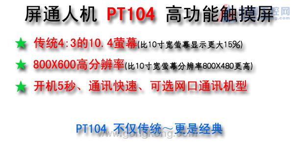 屏通人机 PanelMaster PT104 系列触摸屏,以开机5秒,通讯反应快速,性能可靠稳定傲视群雄,超越同类产品。 800X600高分辨率,采用10.4寸(4:3)工业等级液晶萤幕,比市售商用10寸宽屏萤幕,更大、更清楚、更可靠。 PanelMaster USB 可接u盘,可以将预定下载程序、资料收集数据、配方数据、警报历史全部放入, Slave USB和电脑直接连接,享受程序下载快捷 PT104-1B 全功能三串口 PT104-4B 全功能串口网口型