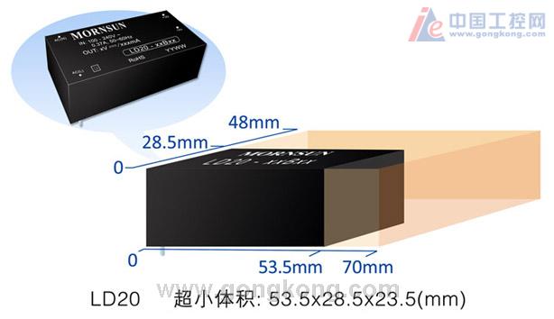在成功推出了LD03(3W)、LD05(5W)、LD10(10W)等LD家族产品后,广州金升阳又紧接着推出了一款全球超小体积的AC-DC电源模块——LD20(20W)。该系列产品在追求小体积的同时,纹波噪声低至50mV,效率更是高达83%,而且具备了更加优越的电磁兼容性,EMI达到EN55022 ClassB水平,EMS符合IEC61000 Level4标准。此款产品仍然延续了AC-DC电源绿色环保、高效节能的亮点。同时,该产品一如既往地保留了低功耗、高安全隔离等特性,并具有输出短路、过流保护等多重保护功能。