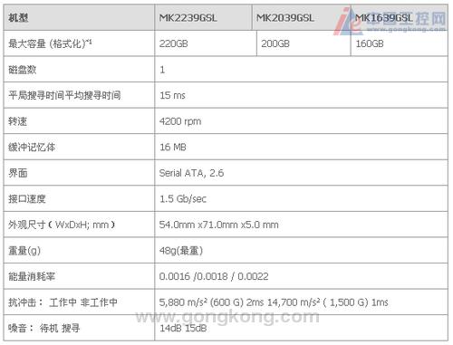 MKxx39GSL系列硬盘同时满足体积小,重量轻及高储存容量的市场需求,三款硬盘皆配备16MB缓存记忆体,提供高效能运作。东芝新款1.8寸硬盘不仅具备轻巧外型,更是SATA界面硬盘中最为省电的机种,工作时格外安静,并拥有出色的抗冲击能力,抗冲击性比最坚固的2.5寸硬盘多了66%。