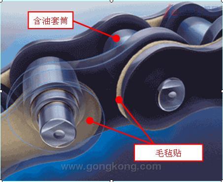 免加油链条通过特殊的工艺设计,能够实现在不加油的情况下,正常的工作,具有出色的磨损寿命,传递效率非常高,能够把传递损耗降低到最低,减少维护时间,创造一个干净的工作环境,同时椿本在免加油链条中加入了油毡,通过油毡的蓄油能力,实现了料链条的超长寿命!其结构如下: