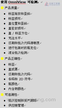 (上海,2010 年10月19日) 康耐视公司(纳斯达克代码:CGNX)今天推出了新一代 OmniView® 360° 检验系统,该系统具有彩色功能和 5 百万像素的高分辨率摄像头。OmniView 允许在生产线上仔细检验和验证无向酒瓶和饮料瓶、罐装物品、药水瓶和其他柱状包装。OmniView 技术使用最新的 Windows® 7、64 位 PC,每分钟可检验 1200 个零件,且无需中断装瓶和包装生产线。