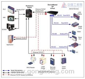 透过Comtrol独家DualConnectPlusTM专利技术,让DeviceMaster UP Modbus实现一机两用,能同时传递现场数据到工业以太网的PLC控制端以及一般TCP/IP的企业应用端,使现场设备无需中断与PLC的控制下,即可透过企业的IT数据库系统同步收集现场端的数据,执行生产规划、库存更新、出发货通知及单据,并追踪货物流向等事务。