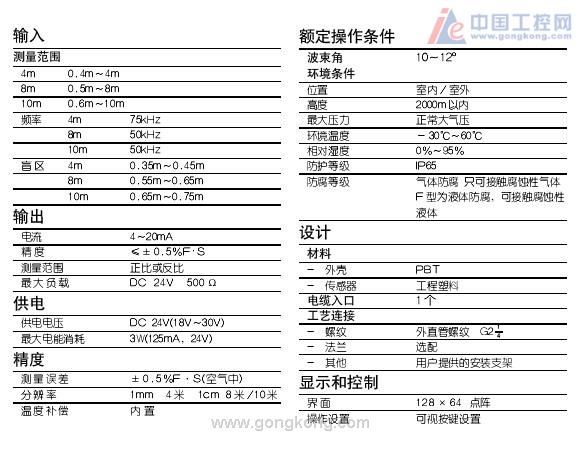 ·传感器采用特殊防腐材料处理,防腐性能强·密钥保护功能 ·在线自校正功能 ·环境温度测量补偿 ·液位、距离互换功能 ·正迁移量设置功能 ·电流输出零点、满度调整功能 ·智能信号处理技术,可适应多种工况环境 ·具有10°、12°的窄声波投射角,确保精确的测量 ·高亮、高清晰、低功耗液晶显示测量 ·近端按键控制,人机界面友好,易于操作 ·24VDC工业标准供电 ·4~20mA电流信号 ·标准螺纹结构,便于安装 ·一体化设计,外形小巧,实用美观 |