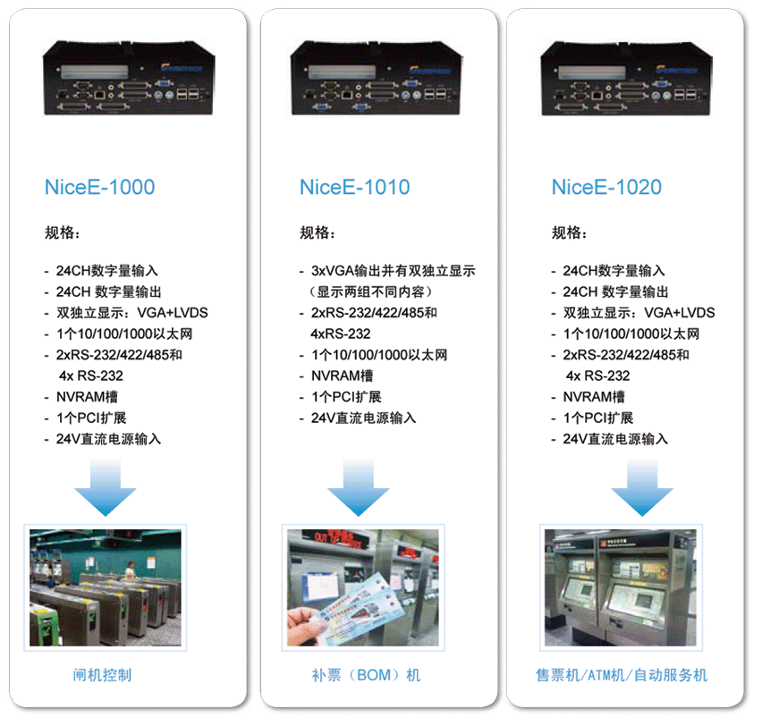 集智达智能最新推出NiceE-1000系列 自动售检票设备地铁专用机。该产品系列是无风扇设计的工业计算机,支持宽范围CPU的Intel 910GMLE芯片组,为解决自动售检票设备但不局限于更多的有限空间应用,如闸道进/出控制设备、自动售票机和检票机、补票机等。