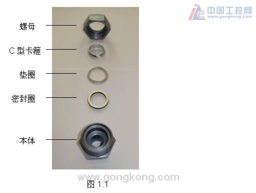 如图1.1所示,82A系列卡套接头由螺母、C型卡箍、垫圈、密封圈和本体组成。