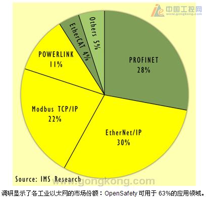 除POWERLINK外,EPSG组织实现了在Modbus TCP、EtherNet/IP和SERCOSIII上OpenSAFETY的完整实现,这将引发该安全协议在市场上快速的建立和成长。4月,Factory杂志进行了一项由独立的第三方市场研究机构IMS进行的调研,根据这一调研,EtherNet/IP以30%的份额占据最大的市场,而ProfiNet则以28%占据第二,22%的应用使用了Modbus TCP/IP,11%使用尤其适用于苛刻实时应用的总线协议POWERLINK,其它总线占据了9%。到目前为止,OpenSAFETY方案占据了63%的潜在市场份额。更多的工业以太网标准将跟随它,并且软件提供了一种通用的安全系统标准的机会,尤其是对于安全技术导向的开发而言,得益于OpenSAFETY的开放性,成本敏感的制造商和现场操作者将会减少其在开发方面所需付出的大量努力。