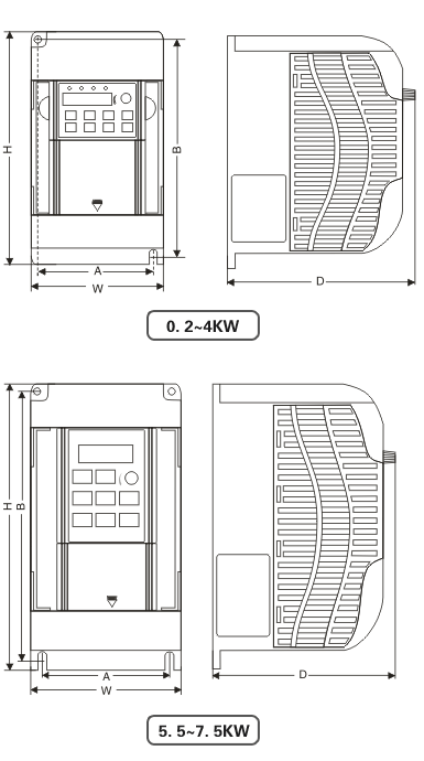 电压 | 功率(KW) | A(mm) | B(mm) | H(mm) | W(mm) | D(mm) | 安装孔径(mm) |