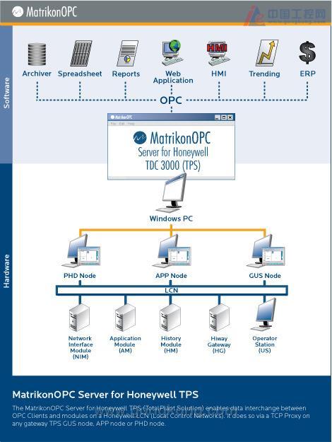 访问 Honeywell TPS/TDC3000 系统的最佳途径 MatrikonOPC 霍尼韦尔 TPS(TotalPlant Solution)服务器使得数据在OPC 客户端和霍尼韦尔LCN(本地控制网络)上的不同模块之间交换。该OPC 服务器使用Honeywell TPS 节点(GUS 节点、APP 节点或PHD 节点)作为通向LCN 的网关。 MatrikonOPC 霍尼韦尔 TPS 服务器可以直接安装在TPS 节点上,或安装在一个可专用的Windows 2000/Windows XP 计算机上。该OPC 服务器通过连接到一个或多个TPS 节点访问LCN 数据,可达到的OPC数据吞吐量取决于可用作网关的TPS 节点的数量。[1][2]下一页>>