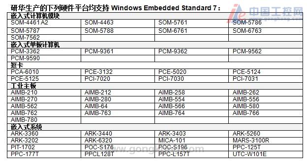 2010 年 5 月 12 日, 嵌入式平台与整合服务供货商研华科技,宣布推出全系列兼容于 Windows Embedded Standard 7 操作系统的嵌入式平台。Windows Embedded Standard 7,功能强大并具备创新特色,内建Embedded Enabling Feature (EEF)功能,能提供嵌入式装置更坚固的防护。此外,藉由研华开发的工具与软件应用程序编程接口(API),Windows Embedded Standard 7可更轻易的整合至各种嵌入式应用,开发出具备更友善用户接口的新装置。