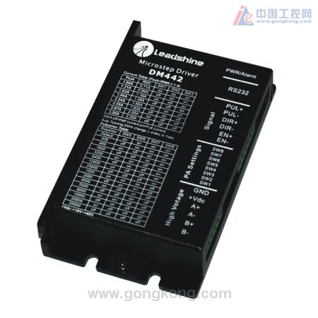 DM442是雷赛低噪声数字式步进电机驱动器DM系列的新成员,其体积小巧、采用32位DSP处理器,具备优秀的超低噪声、超低振动、超低温度、低中高速运行平稳等特点。DM442工作电压范围20-40VDC,最大峰值电流4.2A,15档常规拨码细分设置,适合匹配57-86规格步进电机,适合各种中小型自动化设备和仪器,例如:雕刻机、打标机、切割机、激光照排、绘图仪、数控机床、自动装配设备等。在用户期望小噪声、高速度的设备中应用效果特佳。   DM442的主要技术特点: *工作电压范围20-40VDC *最大峰值电流4.2A *低速、中速抗共振技术 *电机低温控制技术 *可在细分范围内任意设置细分 *电流内部设定功能 *电机参数自整定技术 *匹配57-86规格步进电机 *可通过RS232接口连接电脑调试 *专业图形化调试软件ProTuner和简易数码调试器STU-DM