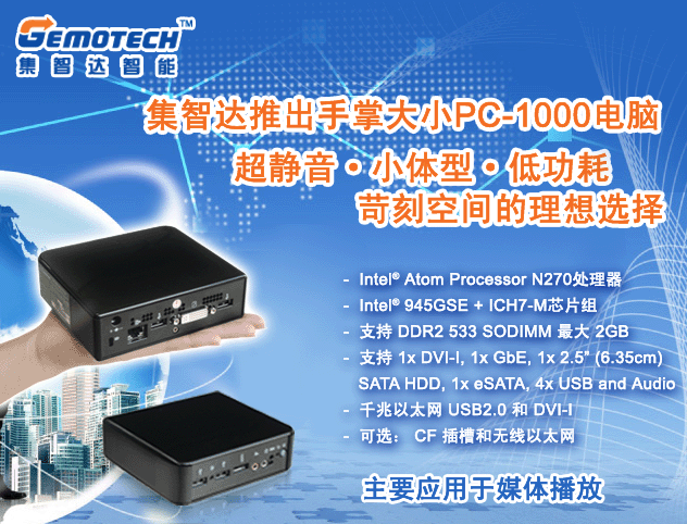 北京集智达智能科技有限责任公司推出手掌大小PC-1000电脑,主要应用于媒体播放。
