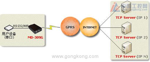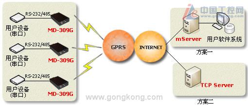 MD-309G可以快速与RTU、PLC、工控机等设备相连,拆壳之后的裸板更可以方便的嵌入用户设备,通过GPRS无线网络将与MD-309G相连的用户设备数据传输到Internet中的一台主机上,实现数据远程透明传输,MD-309G可广泛应用于“物联网”涉及的各个行业: