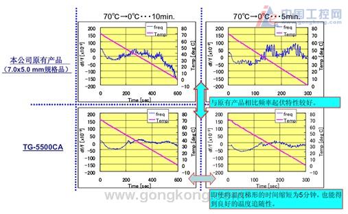 TG-5500CA的频率温度特性是属于OCXO范围的±0.1×10-6。另外因频率校正方式不同,与OCXO相比消耗电流较小。 (上图是使用本公司产品之比较。) (图2) 温度追随性与频率起伏特性的比较 |
