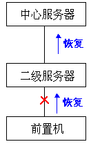 紫金桥支持多级数据恢复。如在下图所示的前置机到二级服务器间出现了通信故障,在线路恢复后,前置机与二级服务器间将进行数据恢复。虽然中心服务器与二级服务器之间没有出现过通信故障现象,但是由于二级服务器在与前置机故障期间,自身数据没有得到刷新,以至造成其上游服务器数据停滞现象。因此在前置机与二级服务器间将进行数据恢复时,也应将中心服务器关心的数据进行恢复。