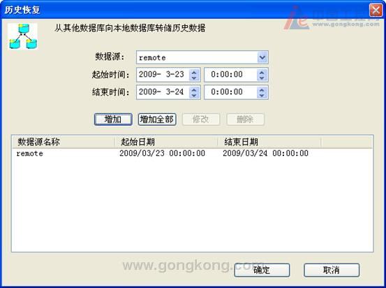 在对话框中可以指定要恢复的数据源,时间范围等信息。确认后数据恢复程序会根据在组态中本地与远程数据源的数据连接对应关系,自动检取远程数据库中的历史数据,并将数据转储到本地数据库中。