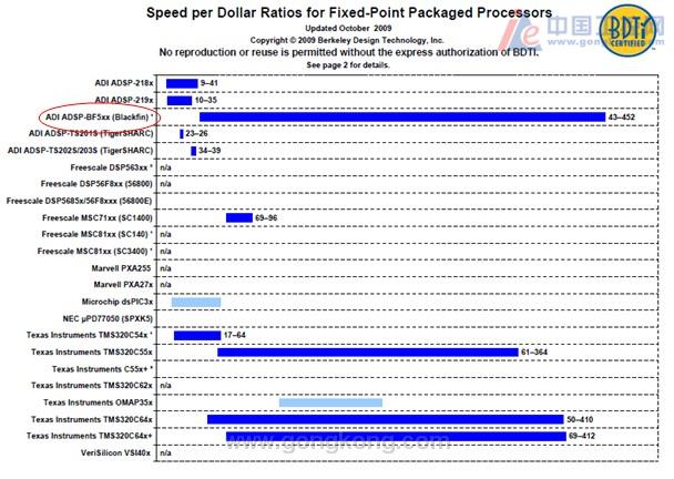 Blackfin处理器自推出以来因为其独特的MCU+DSP的汇聚式架构而受到业界广泛关注,并得到大量应用,无论是汽车电子、工业控制、医疗设备还是消费电子产品领域,无处不见Blackfin的踪迹。高成本和技术门槛曾经让很多企业对于使用DSP处理器心存疑虑,而Blackfin汇聚式处理器的独特架构、性能优势以及全面的技术支持很大程度上克服这个问题,特别是ADI近年来不断推出了更多针对特定应用领域进行优化设计的Blackfin处理器系列,在性能特性得到更强优化的同时,大幅度地降低了产品的价格(BF50x万片批量的最低报价低至4.5美元,独立评估机构BDTI按照对定点处理器的每美元速度比(speed-per-dollar ratio)评估,BF50x的BDTIsimMark2000/$得分高达498,远超同类竞争性器件)。
