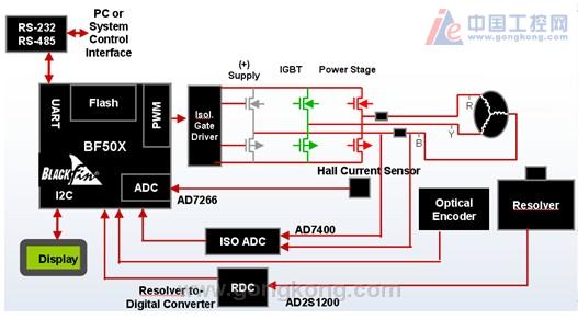 BF50x处理器的卓越性能和特性使电机控制系统设计工程师能实现执行更复杂的算法,确保适应系统行为的实时变化,从而获得平稳的运行性能,并降低功耗。利用无传感器的矢量控制可以实现更高的电机控制效率,利用先进的建模方法可以准确地确定电机位置和/或者速度。设计工程师可以不用位置/速度传感器,从而系统的尺寸更小,降低成本并实现更大的系统可靠性。BF50x 集成的12位ADC提供了准确对电机状态进行建模所需要的准确数据转换,从而可以准确估计电机的准确位置/速度。