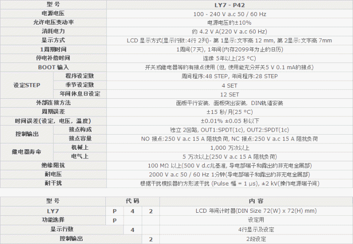 * LY7 - 可简便的确认及变更年间及周间程序的设定内容 - 用季节设定功能,设定随季节变化的周间程序自动转换 - 周间程序上追加年间程序功能 - 用年间休息日设定功能切断休息日,国庆日等的输出 - 面板平行及突出安装共用化(Base Plate DIN 轨道安装)