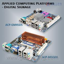 安勤无风扇电子广告牌主板ACP-945GDS采用Intel® Atom™ N270低耗电处理器,及另一具备风扇管理系统的ACP-GM45DS则采用Intel® Core™ 2 Due移动式处理器。两款主机板皆内建SODIMM插槽,支持2GB至4GB的DDR2 SDRAM。安勤电子广告牌主机板整合Intel® GMA架构的3D绘图引擎,并具备Full HD影像播放译码(Playback Decoding)能力,并搭配Realtek 5.1声道高清晰音频,使得其可传递优秀的影音效果。安勤电子广告牌应用主板支持多屏幕设置,并可支持VGA、DVI、LVDS及HDMI多种呈现方式,最高分辨率达2048x1536。连结视讯分配器,可应用在各式大型电视墙。