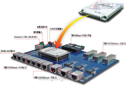IEM7010模块在名片大小的面积内集成了网管型交换机的几乎全部功能,同时为客户提供了高度的设计弹性。客户只要加上变压器和RJ45就可以构成电口,加上光模块就可以构成光口。