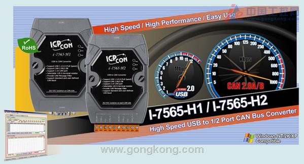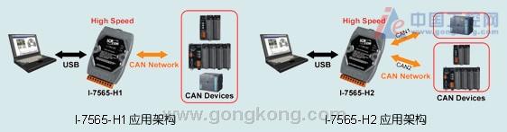 I-7565-H1和I-7565-H2为泓格新推出高速智能型USB/CAN转换器的解决方案,分别提供1个和2个CAN bus通道,可以使用标准USB连接CAN的设备,由于USB具备即插即用功能,因此能够快速地连接CAN设备于计算机上。I-7565-H1/H2之CAN bus通讯效率优于I-7565且均支持CAN2.0A/2.0B通讯协议,并提供5Kbps ~ 1Mbps之不同波特率及使用者自定义波特率的设定,此外亦提供功能强大的Utility工具及API Library函数库,让使用者可以快速建立不同的CAN bus应用,透过使用I-7565-H1/H2,不但可以作为CAN网络监视器,亦可应用于大楼自动化、远程数据收集和控制、环境监测、实验室设备和研究、工厂自动化等等。