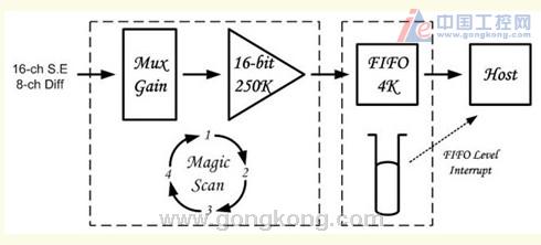 Magic Scan不仅能够使用不同的釆样率来扫瞄不同的通道,还可以针对不同的通道使用不同的增益值。甚至于在多通道扫瞄时,釆样率也可以维持在250KHz/s。 I-8014W拥有两种不同的Magic Scan,一种我们称之为标准型、另一种我们称之为虚拟Sample and hold型。拥有Sample and hold功能的模拟输入卡大部份都非常的贵。但ICP DAS可以提供低价位产品供您选择。 I-8014W 内含有AD使用的FIFO达到4K samples的容量。更在FIFO 上发展一个新的技术。您可以设定FIFO的水位、当采样的数据大于设定的FIFO 水位。即刻会产生中断讯号通知主机。