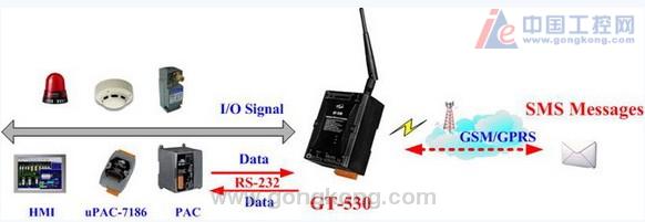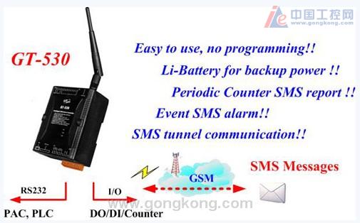泓格GT-530是一款工业用的简讯警报机,能定时回报计数器的数值及透过DI的触发,以简讯方式通知操作者事件的发生而能及时针对事件做处理。无论在任何时间、地点就可使用手机掌握远程作业的状况。也提供RS232接口让PAC、PC或PLC能够以最方便的方式收发简讯,以提供更弹性的应用。无论是机台监控应用、贩卖机监控系统、无人机房监控或游戏机台监控系统都能快速安装使用,只要简单的几个设定步骤后就可使用,不需要用户写任何程序。Utility主要的功能是提供客户,设定GT-530的相关参数,如DI类型、DI触发后要发送的简讯讯息及目标电话、事件警报的开启或关闭及查询简讯发送的记录等等。