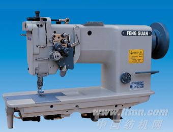 本机采用双直针,立式自动加油旋棱勾线,滑杆挑线,构成二双线锁式线迹。针杆采用机械式分离与联合;上下轴用滚珠轴承支承,同步齿形带传动;柱塞式油润滑系统。采用针杆摆动与送布牙同步送料方式,旋钮式圆盘调节针杠杆式倒顺送料机构,在棱心内缝线回拉弹簧,保证底线与面线得到一致的缝纫效果,适用缝制大衣,制服,牛仔裤、包装、装饰缝等。