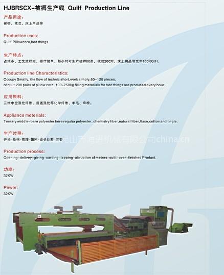 HJBRSC-被褥生产线 产品用途:被褥、床上用品。生产特点:占地小,工艺流程短,操作简单,每小时可生产被褥60条,枕芯200对,床上用品160K...