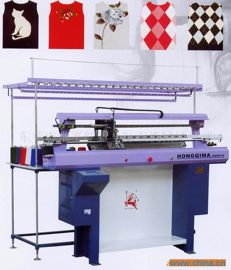 半自动电脑加针横机 电脑加针横机是在手摇针织横机的基础上配上专用微电脑控制的机架,能自动编织羊毛衫的衣片、袖片、围巾等织物。本机具有自动加针、自动