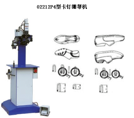 P1:适合于将腰窝部位的鞋帮的帮脚固定在内底上。机器用钢丝自己制作的钉书钉形状的卡箍固定鞋帮。可以加工不同楦型、尺码、后跟及帮高的男鞋、女鞋和童鞋。特别适合于加工特殊的高跟鞋。 P3:机器用以将缝制鞋...