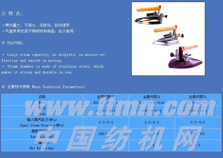 GZY 系列工业用蒸汽熨斗 公司名称:徐州胜家缝纫设备有限公司简介:徐州胜家缝纫设备有限公司成立于1990年元月18日,公司前身为胜家缝纫设备专业店是淮海经济区目前规模最大、品种最全的专营国产、进口