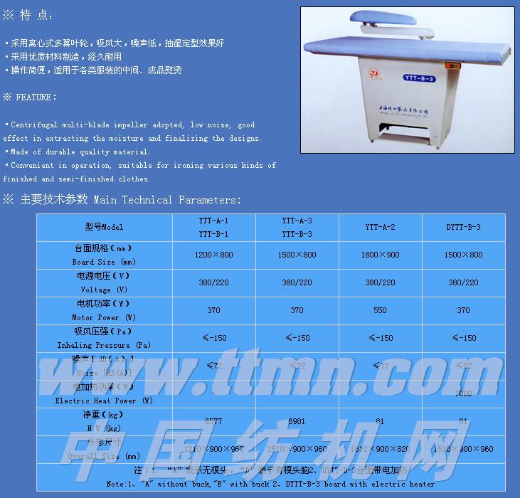 YTT系列熨烫工作台 公司名称:徐州胜家缝纫设备有限公司简介:徐州胜家缝纫设备有限公司成立于1990年元月18日,公司前身为胜家缝纫设备专业店是淮海经济区目前规模最大、品种最全的专营国产、进口缝纫、...