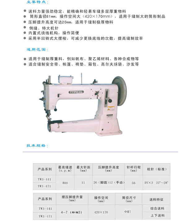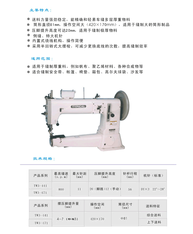 TW3-441筒式综合送料特厚料缝纫机 公司名称:正圆缝纫设备有限公司简介:方圆针车行创办于2001年,专业从事经营各种进口、国产工业缝纫机,整烫设备及其相关的零配件,集销售、安装、维修于一体。主要