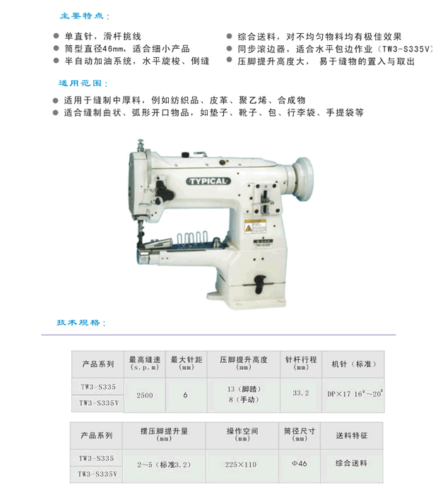产品简介 本机为平板式机体,采用边杆挑线, 大旋梭勾线, 配置上下送料机构和压脚交替提升机构,形成301线迹。缝厚能力强,层缝性能好,倒顺缝隙针距误差小。制品线迹平整,噪音低,维护保养方便