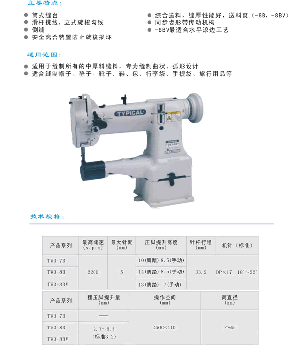 TW3-8B筒式综合送料缝纫机 公司名称:正圆缝纫设备有限公司简介:方圆针车行创办于2001年,专业从事经营各种进口、国产工业缝纫机,整烫设备及其相关的零配件,集销售、安装、维修于一体。主要经销三菱