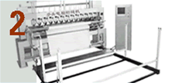 用途 被子、床罩、褥子等的各种图案绗缝 厚被、海棉、皮革等的绗缝作业构造 机头数可从2头到30头 装有检测缝纫机断线自停的光电感应装置 彩