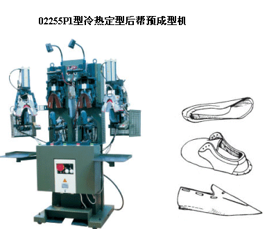 在机器附属的辅助活化站进行活化后,机器可以对插入主跟的后帮部位进行预成型。可以对帮脚部位用卡板成型后经过冷定型使后帮部位稳定的保持其形状。机器可以对尺码在120-310范围内、全部一般跟高(HH)的鞋