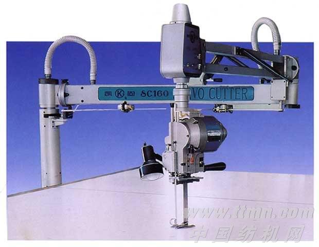SC系列伺服裁剪机 特点 裁剪头被悬挂在摇臂下,由强力的气弹平衡他的重量,因此移动裁剪头比通常的裁剪机轻得多。 因为裁剪头底板比通常的裁剪机底板小很多而且薄,所以插入布层底面非常容易。 伺服裁剪机装