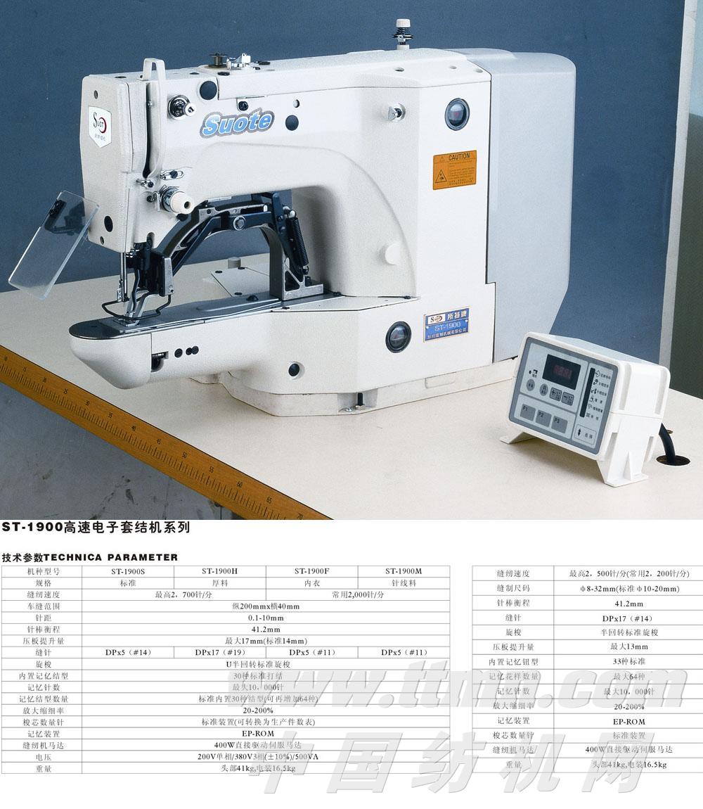 电子套结机 公司名称:乐清市所特缝制机械有限公司简介:浙江省乐清所特缝制机械有限公司,以专业化的技术与完善的优质服务系统,有着多年的生产经验开发制造制衣特种设备,其主要产品有:ST-780 ST-7...
