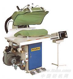 配装特殊前档抑板,可防止成品偏移,以因应「难素材」成品的整烫机。 公司名称:朝日纤维机械贩卖株式会社简介:ASAHI公司在世界纤维机械产业界,率先计划将缩绒机(预缩机)、贴衬机(粘合机)、中间小烫