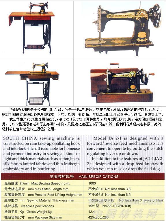 家用缝纫机系列 公司名称:广州市华南缝纫机进出口公司简介:广州市华南缝纫机进出口公司是广州摩托集团公司的核心企业之一,所生产的华南牌缝纫机是我国的名牌产品。企业改革重组后,拥有更先进的生产设备和雄厚...