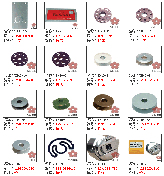 旋梭、梭壳、梭芯、凸轮 公司名称:浙江爱华绣花机配件有限公司简介:浙江爱华绣花配件有限公司 本公司专业生产、直销下列产品: 1、进口、国产多头电脑绣花机零件(日本田岛、百灵达、北京