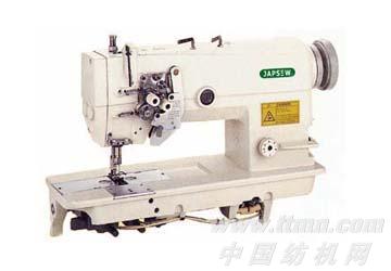 用途: 适用于衬衫,服装,牛仔裤,大衣,女内衣等 详细描述: 本机采用双直针, 立式自动加油旋棱勾线、滑杆挑线构成二行平行锁式线迹;上下轴用高精度同步齿轮传动, 滚珠轴承支撑,机针与送布
